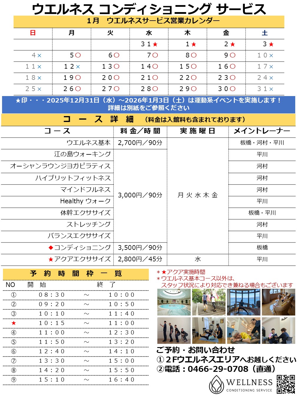 2025年12月26日 / 最終更新日 : 2025年12月26日 enoshima-wellness-service 営業スケジュール 【2026年1月】ウエルネス営業カレンダー 2026年1月の営業日をお知らせいたします。下記料金には、入館料+【温泉+プール(タオル付き)】のご利用料金も含まれております。
